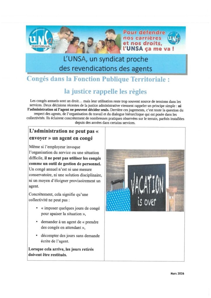 Les congés annuels sont un droit… mais leur utilisation reste trop souvent source de tensions dans les services. Deux décisions récentes de la justice administrative viennent rappeler un principe simple : ni l’administration ni l’agent ne peuvent décider seuls.